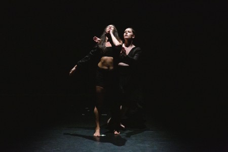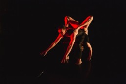 Be that as it may, memory 6 begins with one standing dancer, back to the audience and dressed in what appears to be a woman’s black dress, writhing in apparent agony. I assumed it was thompson, until a body emerged from the darkness stage left, and I saw it was a woman wearing a similar black dress. thompson approached the standing person, who turned (and, not surprisingly at that point, it was knight), and the pair then began a dance that explored the duality symbolized by their almost identical costumes.