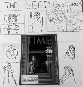 I was inspired by the people of Italy and Spain singing out of their windows and cheering the health care workers. Now, two weeks after this “beginning” every night at 7pm I too go out on my balcony and clap for two minutes. I developed these seed movements/ gestures based on this photo of a woman from Stamford, CT in TIME Magazine.