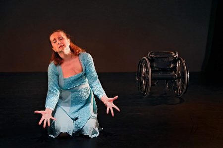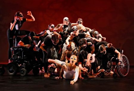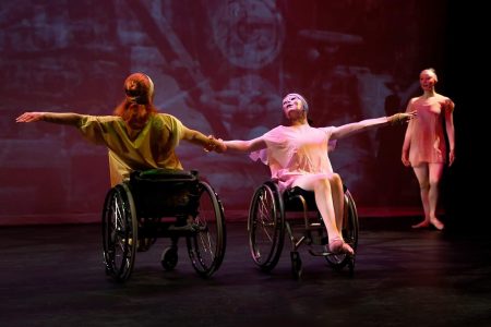 Aside from the progression of wheelchairs (and of dancers with functioning legs) that provide a sense of movement across the stage, most of the visual energy that amplifies Ravel’s beat is accomplished by the performers’ arms. That description might give the impression that Ghosts in the Machine is relatively static, but the opposite is true. It’s a vibrant piece, with the performers in constant motion either crisscrossing the stage or within a narrower, more confined physical area. And, like Ravel’s composition, the dynamism increases as the dance progresses. After awhile, you almost forget that these performers are, predominantly, in mechanical contraptions that enable them to move.