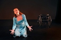 The connection between Lunn and Cook-Beatty soon went beyond tandem arm motion. Their hands connect, and then Lunn rises from her wheelchair and takes a step or two toward Cook-Beatty, then both quickly assume parallel kneeling position on the stage floor. After Cook-Beatty moves the wheelchair that Lunn had been confined to aside, they roll on the floor (again, parallel to each other), and then Cook-Beatty pulls Lunn around the stage floor – as in transporting her rather than coercing her. After Lunn returns to her wheelchair, and Cook-Beatty to a reclining position on the stage floor, they reach toward each other and touch their hands – a la Michelangelo. The piece ends with both Lunn and Cook-Beatty standing in the same parallel position as they were when the dance began, but with Lunn standing.